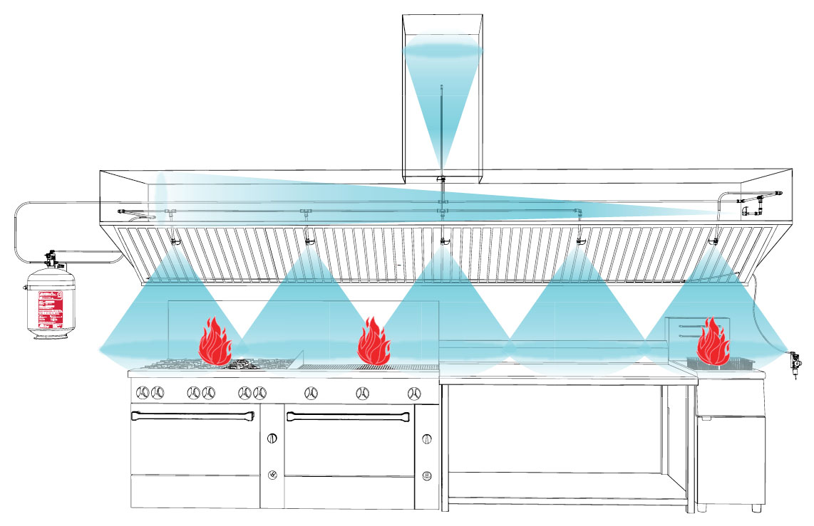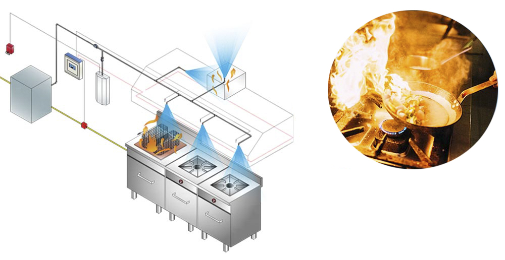 Sistemin devreye girmesiyle yağ yangınları için özel olarak geliştirilen korozif olmayan düşük pH dereceli potasyum karbonat içerikli sıvı kısa sürede ilgili alana yayılır. Yanan yüzeyleri örten ıslak kimyasal ateşin oksijenle temasını keser. Sistem devreye girdiği anda aynı zamanda pişiricilere giden gaz hattı üzerinde bulunan kontrol vanası ile gaz beslemesi de kesilir. Böylece sıkışan gazın patlama riski de ortadan kaldırılmış olur.